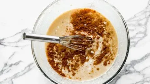 - Whisk in the brown sugar, maple syrup, and vanilla. Sprinkle the baking soda, cinnamon, and salt over the top, then stir until combined.