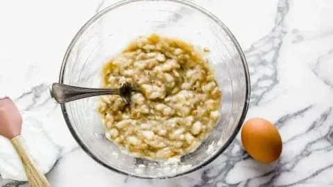 - Mash the bananas in the bottom of a large bowl until mostly smooth.