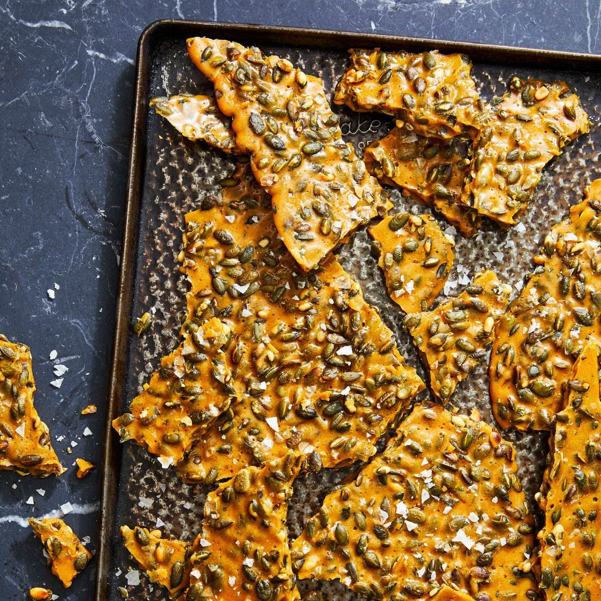 Sweet, savory, and lightly herbed, this pumpkin seed brittle with rosemary and sea salt is a crunchy fall treat perfect for a Halloween get-together.