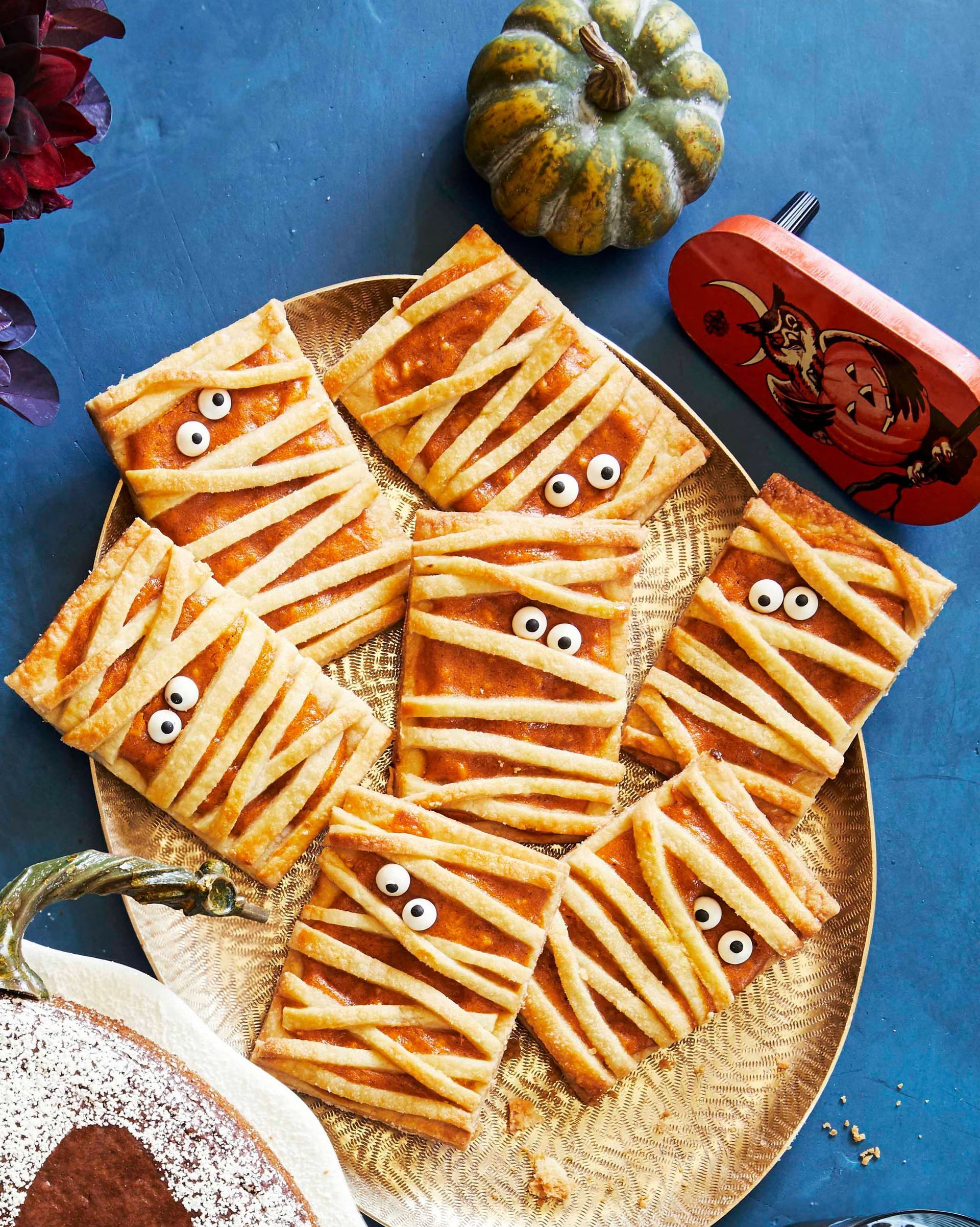 6. Preheat oven to 400°F. Bake until golden brown, 20 to 25 minutes. Cool 20 minutes. Place candy eyes on mummies.